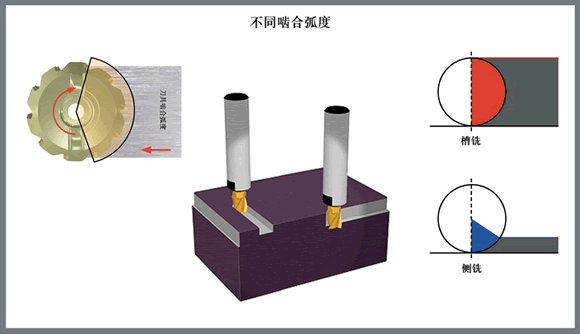 不同銑削工藝的嚙合弧也不同。例如在槽銑中,工件材料在加工過程中包圍一半的刀具;嚙合弧是刀具直徑的 100%。切削刃一半的加工時間都花在切削上,因此熱量迅速積聚。這種情況與側(cè)銑不同,在側(cè)銑中,任何時候都只有相對較小的刀具部分與工件嚙合,并且切削刃有更多的機(jī)會向空氣中散熱。