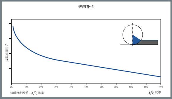 為了保持切削區(qū)內(nèi)的切屑厚度和溫度與刀具在滿刀切削時的值相等,刀具供應(yīng)商制定了補償系數(shù),用于在刀具嚙合量百分比減小時增加切削速度。